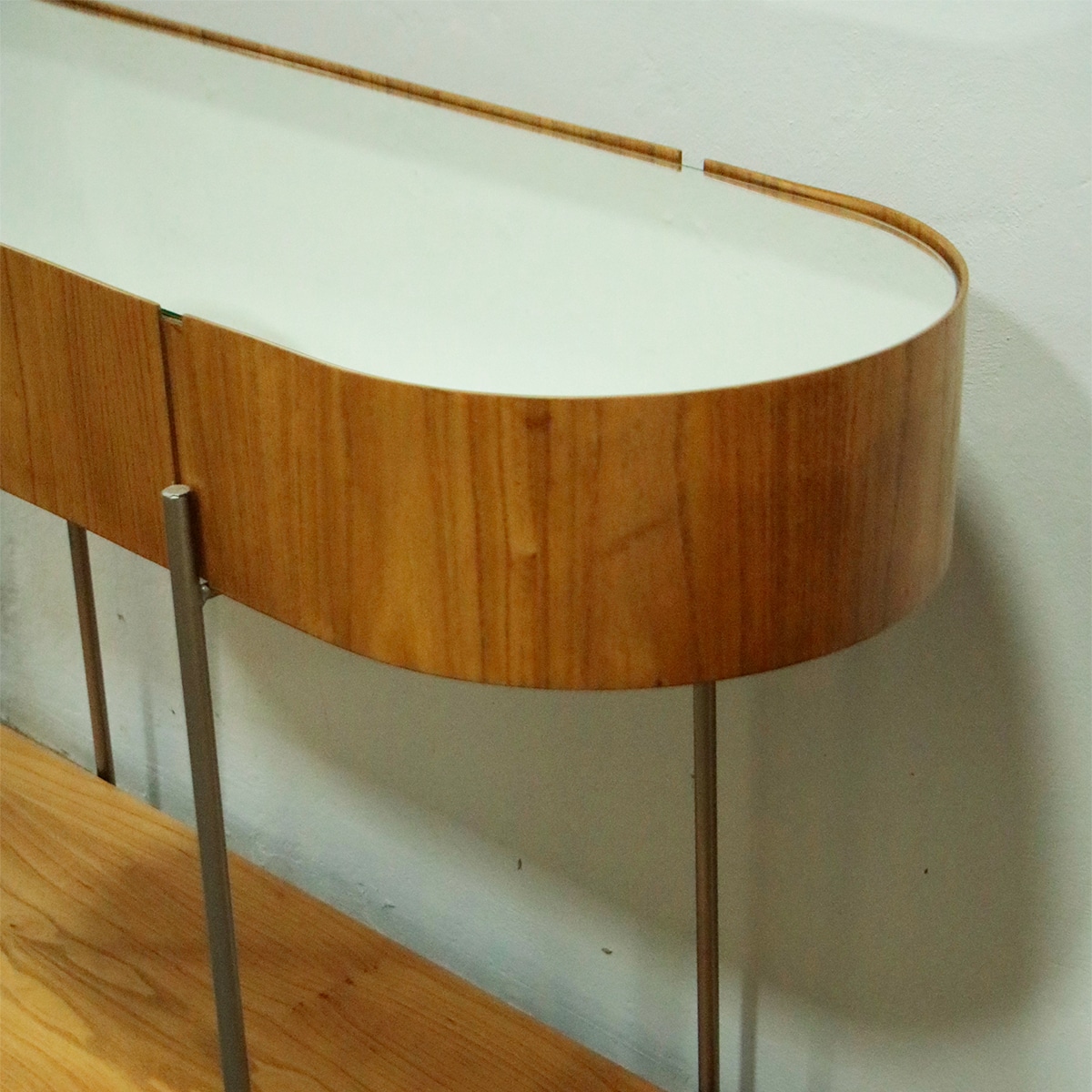 Detalhe especial: o espelho lapidado em formato orgânico traz um charme exclusivo ao tampo e valoriza a composição decorativa com leveza e sofisticação.