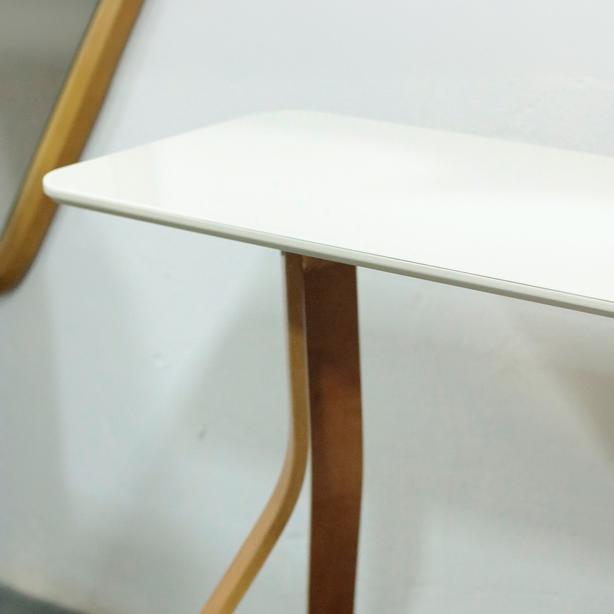 O design fluido da base em madeira maciça proporciona leveza visual, ao mesmo tempo em que garante firmeza e durabilidade. O tampo em MDF laqueado com vidro traz um toque de sofisticação, além de ser fácil de limpar e resistente ao uso diário.