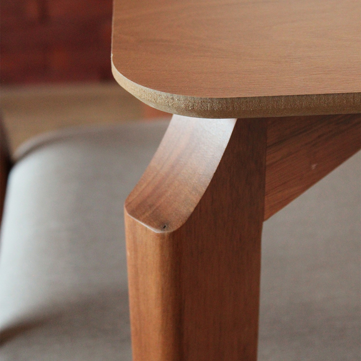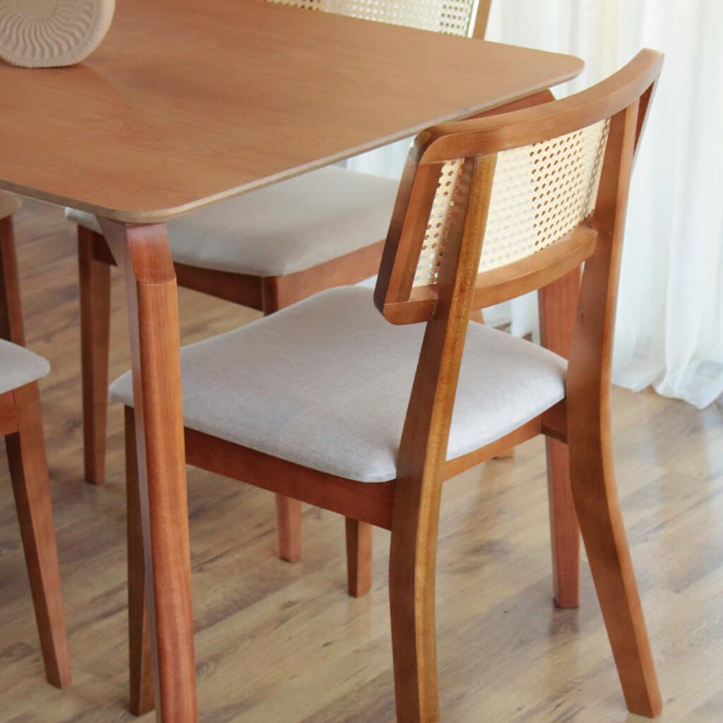A mesa com tampo em BP texturizado e base laminada cria um visual sofisticado, enquanto as cadeiras estofadas com revestimento em couro sintético e braços em corda náutica garantem uma experiência de uso muito mais agradável, seja no dia a dia ou em jantares especiais.