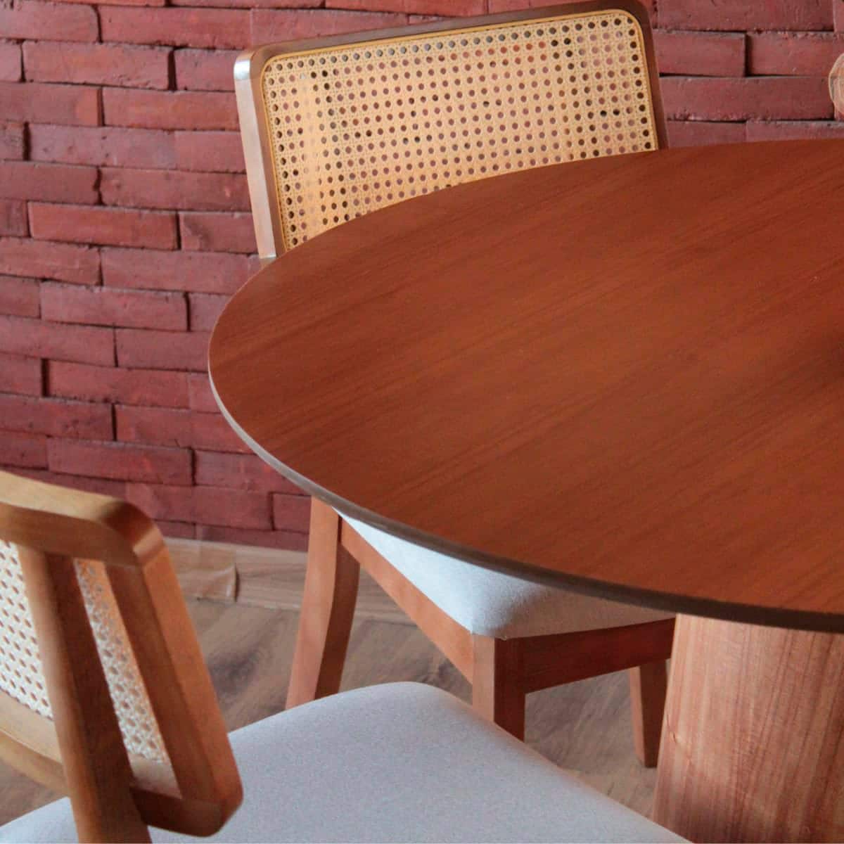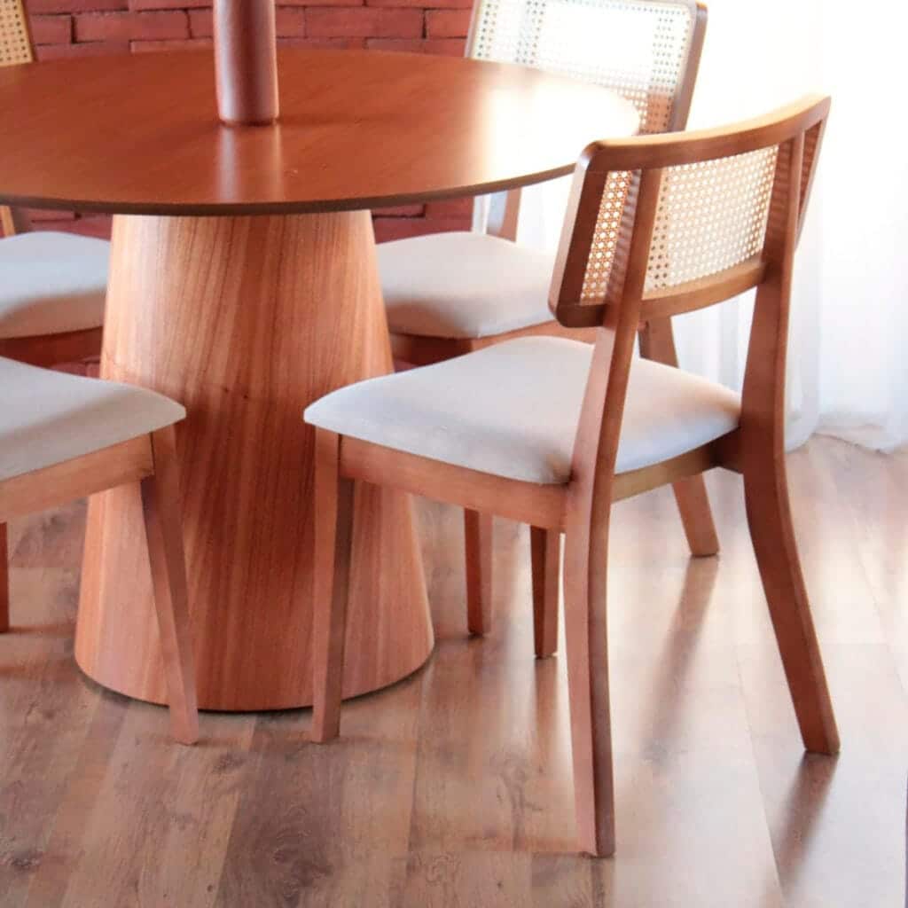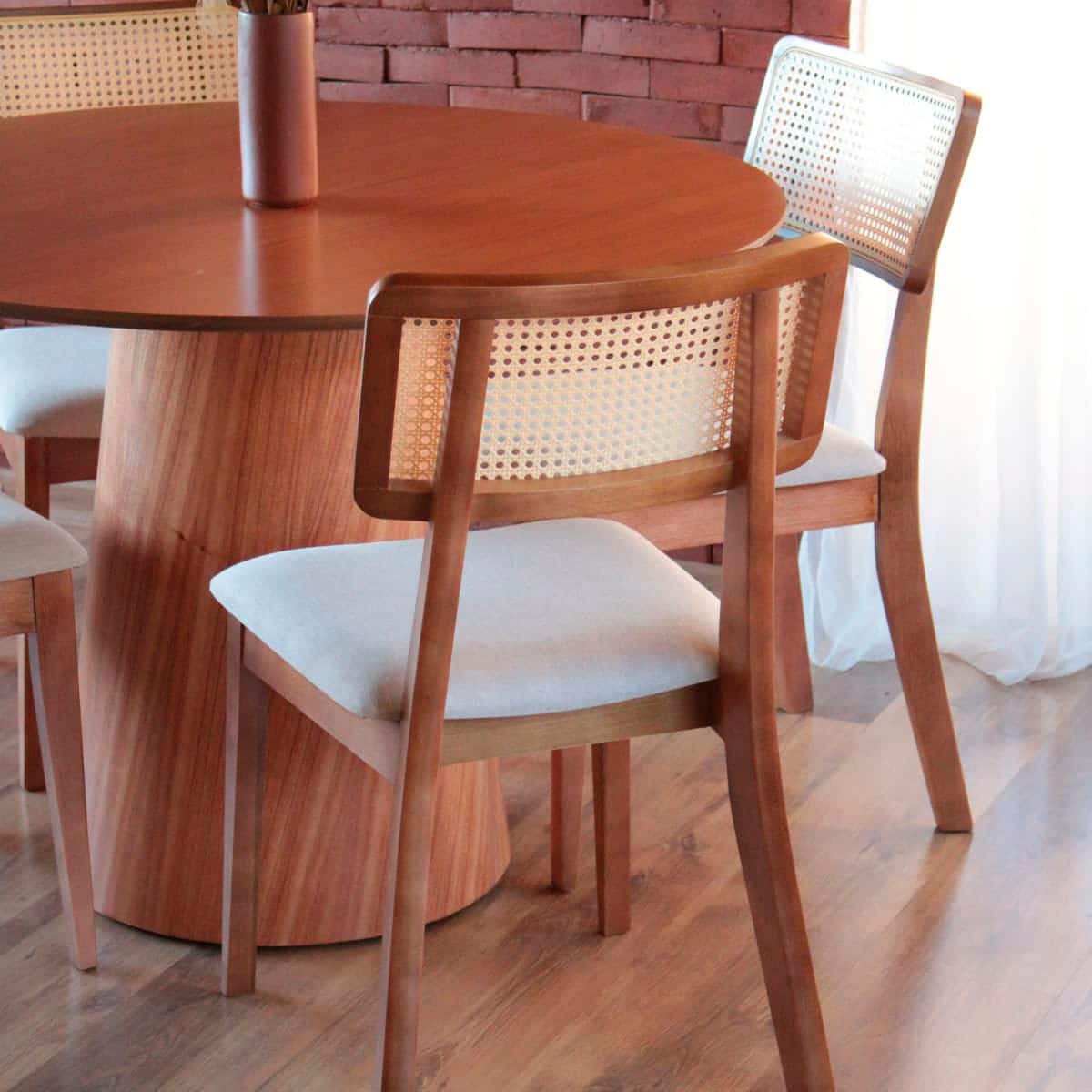 As Cadeiras Lilia complementam o conjunto com muito charme e conforto. Produzidas em madeira maciça de lei, possuem assento estofado em linho e encosto em rattan sextavado, resultando em um visual atemporal e aconchegante. O design ergonômico com encosto levemente curvado garante apoio e conforto prolongado, tornando cada momento à mesa ainda mais especial.