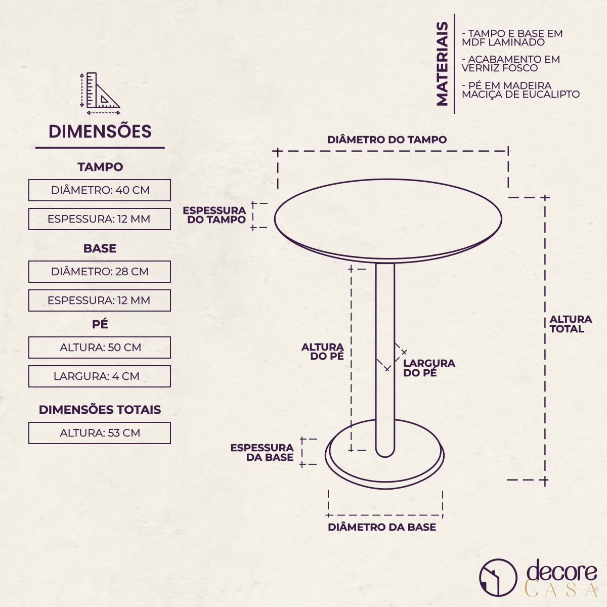 A Mesa Redonda é ideal para adicionar estilo e funcionalidade a qualquer espaço em sua casa, seja na sala de estar, no escritório ou até mesmo no quarto. Ela se adapta perfeitamente às necessidades do seu dia a dia.Além de ser um ótimo apoio para bebidas, lanches, controles remotos, revistas e livros, a Mesa Redonda possui uma base de Madeira Maciça de Eucalipto, oferecendo suporte sólido e confiável. Seu design compacto e elegante garante que ela se encaixe em qualquer ambiente.Especificações técnicas: